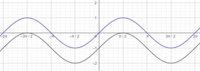 Narysujmy wykres sin(x). Następnie należy wyznaczyć wektor przesunięcia, w tym przypadku [0, -1] i przesunąć o niego wykres sin(x).