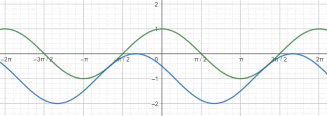 2. Zbiór wartości funkcji zostaje zmieniony, ponieważ wykres cos(x) został przesunięty względem osi OX o “-1”, co sprawia, że wynosi on