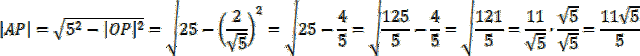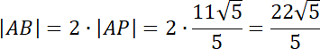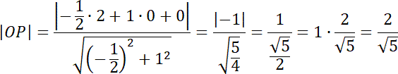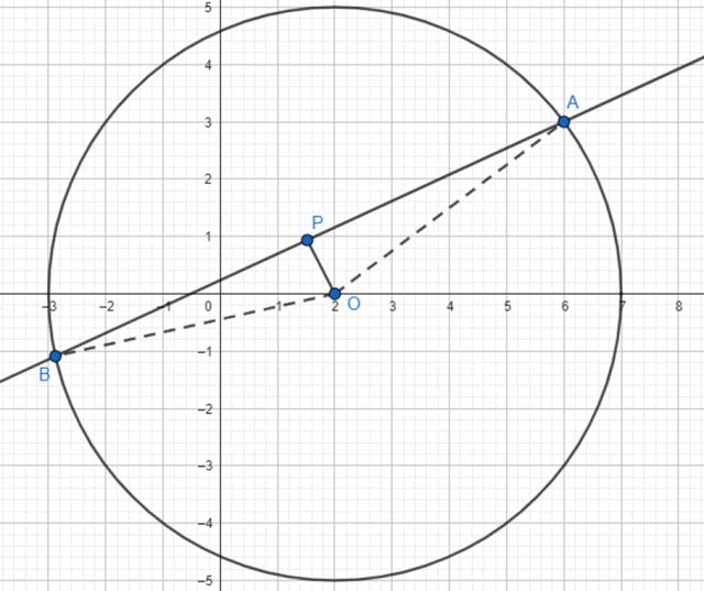 Zacznij od obliczenia długości |OP|, korzystając ze wzoru na odległość punktu od prostej. Kolejno oblicz długość odcinka |AP|. Wiedząc, że trójkąty OPA i OPB są przystające, wyznacz długość cięciwy |AB|.