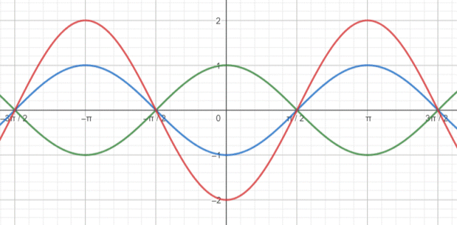 (kolor zielony). Następnie odbij go symetrycznie względem osi OX (kolor niebieski). Na koniec przekształć wykres przez powinowactwo prostokątne o osi OX i skali 2 (kolor czerwony).