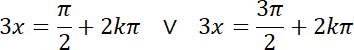 Aby rozwiązać zadanie, zacznij od spierwiastkowania go i rozdzielenia na alternatywę dwóch równań. Następnie wyznacz, dla jakich wartości sinus przyjmuje wartość 1 i -1 oraz przyrównaj te rozwiązania do argumentu sinusa: 3x. Rozwiąż oba otrzymane równania, a następnie zauważ, że zbiór wartości rozwiązań równania można zapisać jako