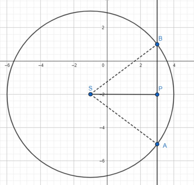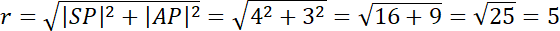 Odczytaj długości odcinków |AB|, |AP|, |BP| i |SP| z rysunku. Następnie skorzystaj z twierdzenia Pitagorasa, aby obliczyć długość promienia. Na koniec zapisz równanie okręgu, znając współrzędne jego środka i długość promienia.