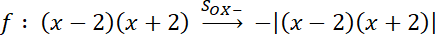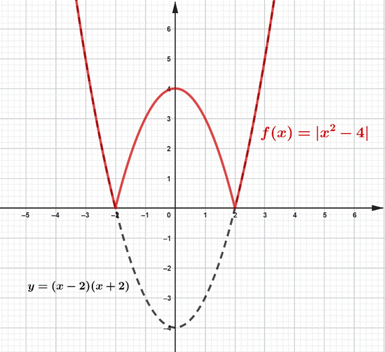 Sporządź schemat wykresu funkcji, odbijając funkcję y=(x-2)(x+2) w symetrii SOX- względem osi OX. Odczytaj z niego, że funkcja posiada maksimum lokalne dla x = 0. Ponadto zauważ, że w tym punkcie istnieje styczna do wykresu funkcji, więc także nie istnieje pochodna funkcji w tym punkcie (funkcja jest gładka).
