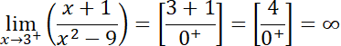 Po podstawieniu w granicach wartości nieco większych i nieco mniejszych niż 3 i -3 otrzymujesz odpowiednio dla obu punktów nieskończoność oraz minus nieskończoność, a więc granice niewłaściwe. Stąd wnioskuje się, że w punktach