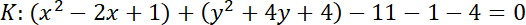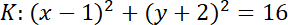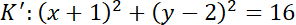 Zacznij od zapisania równania okręgu K w postaci kanonicznej. Okrąg K ma środek w punkcie S(1, -2). Okrąg K’ ma środek w punkcie S’(-1, 2) – symetrycznie względem środka układu współrzędnych. Odczytaj z równania okręgu K, że r = 4. Zapisz równanie okręgu K’ i wykonaj rysunek.