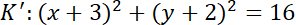 ma środek w punkcie S’(-3, -2) i promień długości 4. (Punkt symetryczny względem osi OX do punktu P(a, b) to punkt P’(a, -b).).