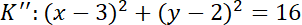 Okrąg K” ma środek w punkcie S”(3, 2) oraz promień 4. (Punkt symetryczny względem osi OY do punktu Q(a, b) to punkt Q’(-a, b).). Zapisz równania tych okręgów, znając współrzędne ich środków oraz długości promieni.