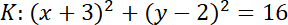 Okrąg K posiada środek w punkcie S(-3, 2) oraz promień r = 4.