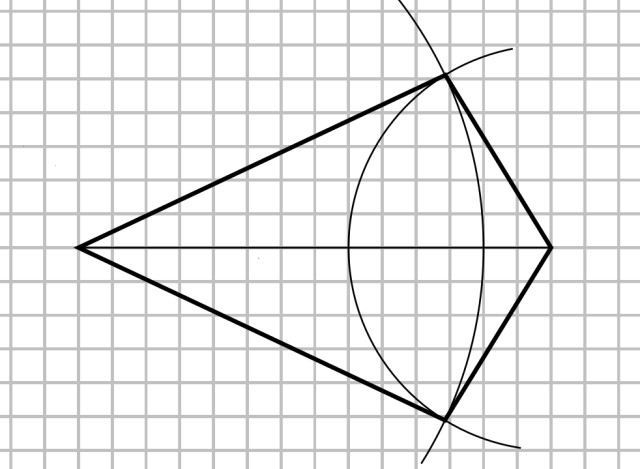 Kratka na rysunku ma bok długości . Przy konstruowaniu deltoidu skorzystaj z tego, że przekątna długości dzieli go na dwa trójkąty o bokach długości . Skonstruuj te trójkąty: najpierw zaznacz odcinek o długości , a potem z jego końców poprowadź łuki o promieniach i punkty przecięcia łuków wyznaczą wierzchołki trójkątów.
