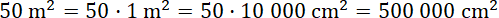 Zauważ, 50 m2 to pięćdziesiąt razy po 1 m2, więc możesz zamienić 1 m2 na cm2 (1 m2 to 10 000 cm2, bo 1 m to 100 cm), a otrzymany wynik pomnożyć przez liczbę 50.