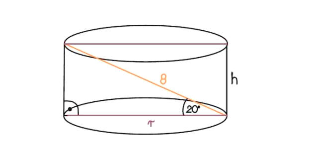 W tym zadaniu musisz obliczyć objętość i pole powierzchni walca, wiedząc, że kąt między przekątną przekroju osiowego a średnicą podstawy walca ma miarę 20°, a długość przekątnej wynosi 8.