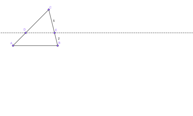 Wiedząc, że bok trójkąta jest podzielony, przez prostą równoległą do AB, na części o wartościach 2 i 5 oraz powierzchnia ABC jest równa 20, określ powierzchnie powstałych figur. Rozważ dwie opcje.