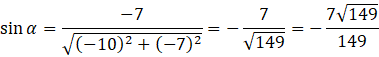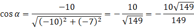 P = (-10, -7) – punkt leży w III ćwiartce układu i należy do prostej y = 0,7x, leży zatem na ramieniu końcowym kąta α.