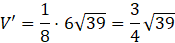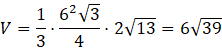 Dany jest ostrosłup prawidłowy trójkątny o krawędzi podstawy długości 6 oraz krawędzi bocznej długości 8. Przeprowadzono przez niego płaszczyznę równoległą do podstawy ostrosłupa w taki sposób, że punkt wspólny wysokości ostrosłupa oraz tej płaszczyzny dzieli wysokość na odcinki o równych długościach. Oblicz objętość ostrosłupa ściętego o górnej podstawie z przekroju utworzonego przez rozważaną płaszczyznę.