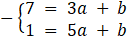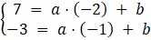 , zatem podstawiamy współrzędne punktu A oraz współrzędne punktu B do równania prostej i zapisujemy układ równań, który rozwiązujemy, aby obliczyć współczynniki a i b tej prostej: