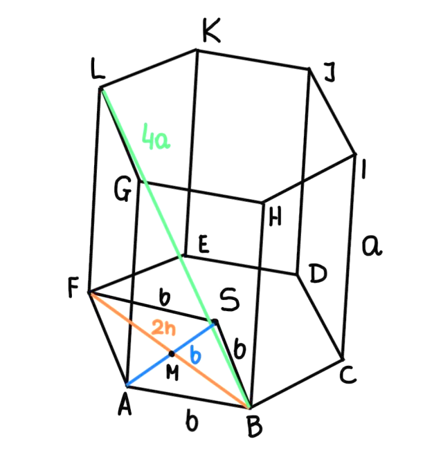 1. Skorzystaj z twierdzenia Pitagorasa dla trójkąta FBL i wyznacz długość odcinka oznaczonego jako h. Zauważ, że krótsza przekątna podstawy jest 2 razy dłuższa niż wysokość trójkąta równobocznego o boku b. Skorzystaj ze wzoru na długość wysokości trójkąta równobocznego i wyznacz b. Oblicz pole podstawy graniastosłupa. Oblicz pole ściany bocznej figury, a następnie jej całkowite pole powierzchni bocznej, całkowite pole oraz objętość.