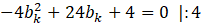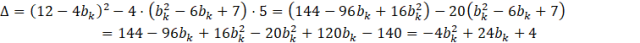 Dostałeś kolejne równanie kwadratowe. Pamiętaj, że jest to osobne równanie niż to które dostałeś z układu równań. Tam, było to równanie ze względu na x i jego rozwiązaniem była jakaś wartość x (czyli pierwszej współrzędnej punktu styczności). Natomiast tutaj zmienną jest bk i wynikiem będzie wartość właśnie tego współczynnika. Aby otrzymać wynik wystarczy, że rozwiążesz to równanie kwadratowe.