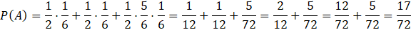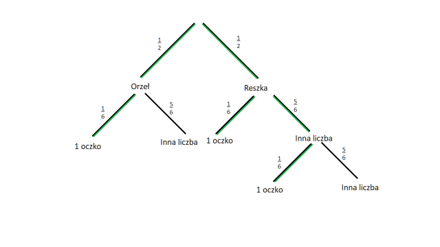 Ponieważ doświadczenie losowe jest wieloetapowe, w tym zadaniu musisz narysować drzewko. Pierwszy poziom drzewka będzie odpowiadał rzutowi monetą, zaś drugi – rzutowi kostką. Rzucając monetę może wypaść orzeł lub reszka, zaś rzucając kostką możesz wyrzucić albo jedynkę, albo coś innego i te przypadki zaznaczasz jako gałęzie. Po wyrzuceniu reszki masz dwa rzuty, które również musisz zaznaczyć. Jednak, jeśli wyrzucić za pierwszym razem jedynkę, to warunek z zadania zostanie spełniony i nie musisz rysować trzeciego rzutu. Prawdopodobieństwo wyrzucenia zarówno orła jak i reszki wynosi jedna druga, zaś wyrzucenia jedynki kostką – jedną szóstą. Gdy już narysujesz drzewo zaznacz te zdarzenia, których prawdopodobieństwo będziesz liczył oraz wszystkie gałęzie po drodze. Następnie przemnóż przez siebie prawdopodobieństwa na poszczególnych gałęziach oraz dodaj do siebie uzyskane wyniki z różnych gałęzi.