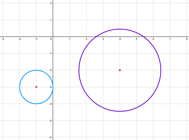 Ułóż układ równań z równań okręgów. Przeprowadź te równania do postaci ogólnej, a następnie dodaj stronami. Podstaw otrzymaną w ten sposób prostą do jednego z równań okręgów. Oblicz wyróżnik otrzymanego wielomianu stopnia drugiego. Jest on mniejszy od zera, czyli nie ma on żadnych rozwiązań; okręgi się nie przecinają. Równoważnie można pokazać, że okręgi są rozłączne zewnętrznie.