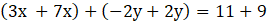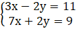 Aby rozwiązać układ równań metodą przeciwnych współczynników, musisz sprawdzić, czy w układzie równań, przy x lub przy y znajdują się przeciwne współczynniki. W tym układzie równań przy y jest współczynnik 2 i –2. W takim przypadku możemy dodać do siebie obie strony obu równań, czyli dodajemy: 3x do 7x, 2y do –2y i 11 do 9. W wyniku tej czynności usuwamy z układu równań niewiadomą y i możemy obliczyć x. Następnie obliczona wartość x wstawiamy do pierwszego lub drugiego równania i obliczamy y.