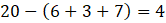 Od liczby wszystkich owoców, która wynosi 20, musisz odjąć sumę owoców: tylko kwaśnych – 7, kwaśnych i żółtych – 3, ani kwaśnych, ani żółtych – 6. Wynikiem odejmowania jest ilość owoców należących do zbioru