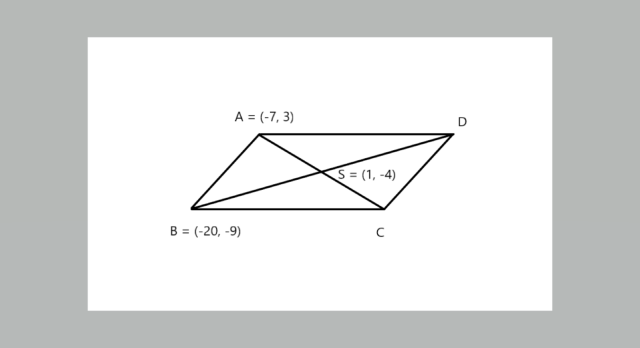 W tym zadaniu trzeba znaleźć współrzędne pozostałych wierzchołków równoległoboku ABCD, wiedząc, że punkty A = (-7, 3) i B = (-20, -9) są sąsiednimi wierzchołkami oraz że przekątne przecinają się w punkcie S = (1, -4).