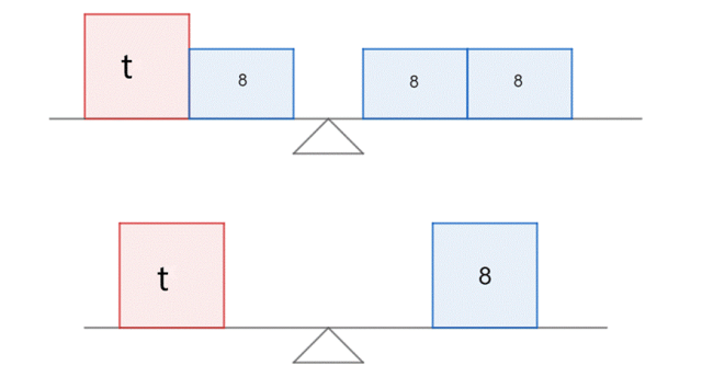 Zauważ, z szalek możemy zdjąć takie same masy i waga wciąż będzie w równowadze. Zdejmij więc po 8 kg z każdej szalki. Z jednej strony pozostała sama niewiadoma, a z drugiej – masa pozostałych ciężarków, która jest jednocześnie wartością t.
