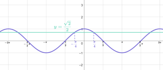 Zwróć uwagę, że takich przedziałów jest nieskończenie wiele, a różnica pomiędzy odpowiednimi punktami w każdym kolejnym z nich wynosi 2π, co wynika z okresowości funkcji cosinus.
