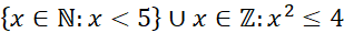 Zbiór jest określony jako suma dwóch zbiorów: liczb naturalnych mniejszych niż 5 oraz liczb całkowitych, których kwadrat jest mniejszy lub równy 4. Do pierwszego zbioru należą liczby: 0, 1, 2, 3, 4. Natomiast do drugiego zbioru: - 2, - 1, 0, 1, 2. Suma to połączenie elementów obu zbiorów zatem należą do niego elementy: - 2, - 1, 0, 1, 2, 3, 4.