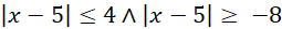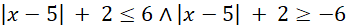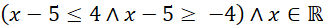 Opuszczamy wartość bezwzględną poprzez rozbicie na dwa przypadki nierówności, pamiętając o zmianach znaku i kierunku nierówności w drugim przypadku. Rozwiązaniem jest iloczyn wszystkich przedziałów