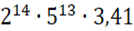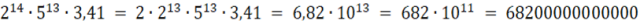 Na początku należy rozbić liczbę, 214, a (2 ∙ 2)13, następnie zapisujemy iloczyn 213 ∙ 513 jako 1013 oraz iloczyn 2 ∙ 3,41 = 6,82. Otrzymujemy mnożenie 6,82 ∙ 1013 . Przesuwamy przecinek o dwa miejsca, zatem potęga 10 zmniejsza się do 1011 zatem mamy 628 i 11 zer. Cyfr jest