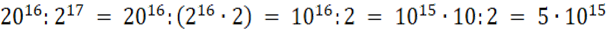 Na początku należy rozbić liczbę 217 na 216 ∙ 2następnie zapisujemy iloraz 2016 : 216 jako 1016. Otrzymujemy dzielenie 1016 : 2 . Należy zamienić 1016 na 1015 ∙ 10, aby móc podzielić pojedynczą dziesiątkę przez 2. Otrzymujemy 5 ∙ 1015, czyli pojedynczą cyfrę i 15 zer, czyli liczbę 16 cyfrową.