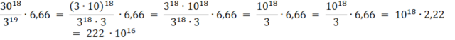 Na początku należy rozbić liczbę 3018 na 318 ∙ 1018 oraz 319 na 318 ∙ 3. Następnie skrócić licznik i mianownik o powtarzającą się wartość. Zapisujemy iloczyn 1018 : 3 ∙ 6,66 jako 1018 : 3 ∙ 6,66. Otrzymujemy mnożenie 1018 ∙ 2,22