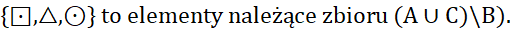Przyjrzyj się elementom, które musisz uzyskać w tym podpunkcie. Wiemy, że występują one w zbiorze A oraz C, ale sumując te dwa zbiory, otrzymamy kilka znaków ponad te, które potrzebujemy. Należy zatem odjąć od sumy tych zbiorów elementy zbioru B.