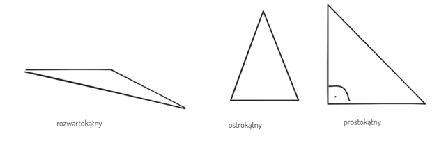 Trójkąt ostrokątny ma wszystkie kąty ostre, trójkąt prostokątny ma jeden kąt 90 stopni, a trójkąt rozwartokątny ma jeden kąt rozwarty.