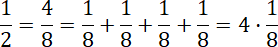 Zapisz wartość ósemki i półnuty. Zauważ, jedną drugą możesz zapisać jako cztery ósme. Ułamek