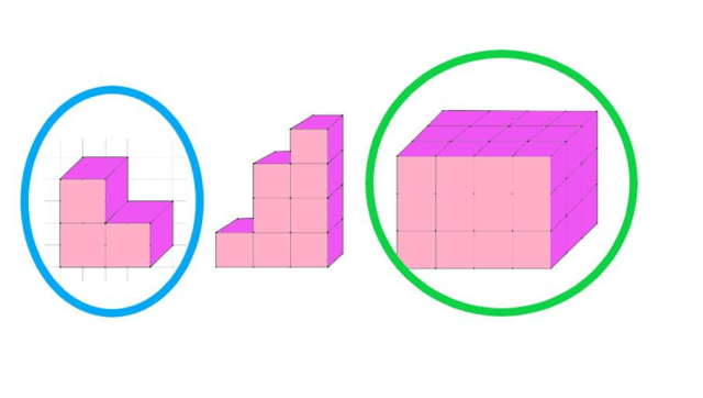 Pierwsza budowla jest zbudowana z 3 sześcianów 1 x 1 x 1, a trzecia z 36 sześcianów 1 x 1 x 1.
