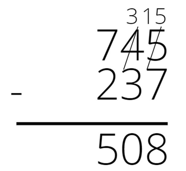 Zapisz liczby jedna pod drugą. Odejmuj kolumnami. Jeśli cyfra górna jest mniejsza od dolnej, to dodaj do niej 10, a cyfrę po lewej stronie zmniejsz o 1 i wykonaj odejmowanie na nowo powstałych liczbach. Jeśli nowo napisana liczba jest mniejsza od dolnej cyfry, to powiększ ją o 10, a następną cyfrę po lewej zmniejsz o 1. Jeśli musimy zmniejszyć o 1 cyfrę 0, to zamień ją na 9 i zmniejsz o 1 następną cyfrę po lewej stronie.