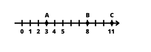 Musisz narysować oś liczbową. Następnie dobrać jednostkę i zaznaczyć punkty A = 3, B = 8, C = 11.
