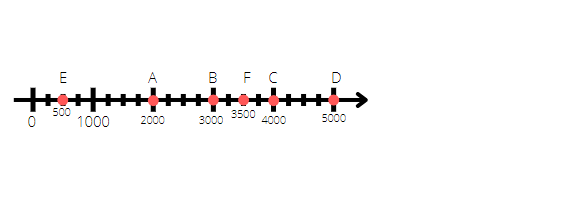 Są 3 punkty dzielące odległość między 0 a 1000 na 4 równe części, więc wystarczy 1000 : 4 = 250. Nasza jednostka to 250. Teraz wystarczy odpowiednio policzyć współrzędne wzrastające o 250.