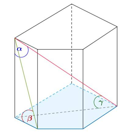 Zaznacz kąty α, β i γ oznaczające odpowiednio kąt między narysowaną przekątną graniastosłupa a krawędzią boczną, kąt między narysowaną przekątną ściany bocznej a krawędzią podstawy oraz kąt między narysowaną przekątną graniastosłupa a podstawą w graniastosłupie prostym pięciokątnym na rysunku.