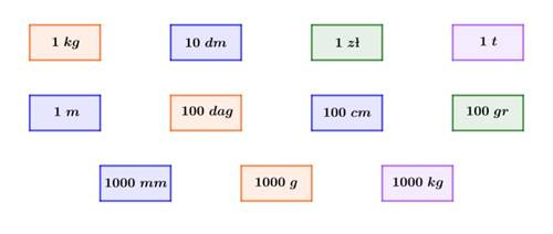 Skorzystaj z zależności między wielkościami określającymi długość, masę oraz kwotę.