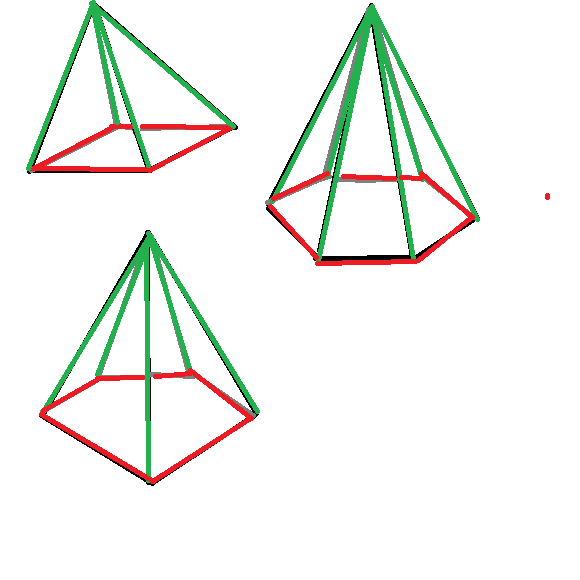 Pierwszy ostrosłup ma 4 krawędzie zielone i 4 czerwone. Drugi ostrosłup ma 6 krawędzi zielonych i 6 czerwonych. Trzeci ostrosłup ma 5 krawędzi zielonych i 5 krawędzi czerwonych.