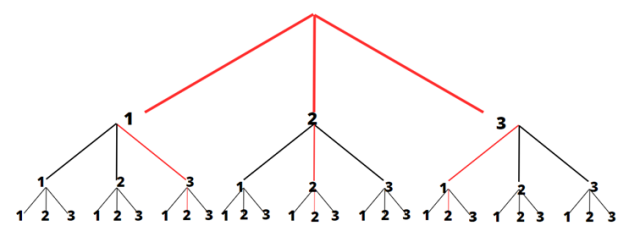 W tym zadaniu musisz wykonać drzewo dla doświadczenia polegającego na wylosowaniu ze zbioru {1, 2, 3} trzy razy jednej cyfry i stworzeniu liczby trzycyfrowej. Następnie wyróżnij kolorem gałęzie, które odpowiadają zdarzeniom elementarnym sprzyjającym zdarzeniu A – otrzymana liczba dzieli się przez 6.
