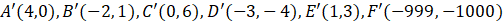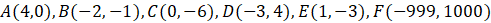 Wyznacz punkty symetryczne względem osi OX do punktów A(4, 0), B(-2, -1), C(0, -6), D(-3, 4), E(1, -3), F(-999, 1000).