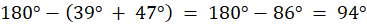 Trójkąt, którego kąty mają 39°, 47°, 94° jest rozwartokątny, zatem środek okręgu opisanego na tym trójkącie nie należy do trójkąta.