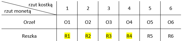 Na początku dobrze jest określić co jest tutaj zdarzeniem losowym. Jest to wyrzucenie reszki oraz wyrzucenie liczby oczek nie mniejszej niż 4. Najlepszym rozwiązaniem tutaj jest narysowanie tabeli z wszystkimi możliwymi wynikami tych rzutów. Tę tabelę dla ułatwienia sobie zaznaczania, możesz wypełnić kombinacjami rzutów monet i kostki. Następnie zaznacz które z tych kombinacji spełniają warunek z zadania. Zauważ, że cała tabela reprezentuje przestrzeń zdarzeń elementarnych, więc musisz policzyć, ile jest komórek w tabeli. Najszybciej to zrobisz przez pomnożenie ilości wierszy i komórek. Natomiast zdarzeniem losowym będą zaznaczone przez ciebie rzuty i także musisz policzyć, ile ich jest. Dalej korzystasz z klasycznej definicji prawdopodobieństwa.