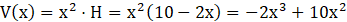Na podstawie, które są dwie składają się po 4 krawędzie równej długości oraz 4 krawędzie odpowiadające długości wysokości. Wiedząc, że ich suma wynosi 40, wyznaczamy z tego równania H. Wyznaczamy dziedzinę, biorąc pod uwagę, że wysokość musi być liczbą dodatnią. Tworzymy wzór wielomianu V opisującego objętość tego prostopadłościanu, mnożąc pole podstawy przez wyznaczone z równania H.