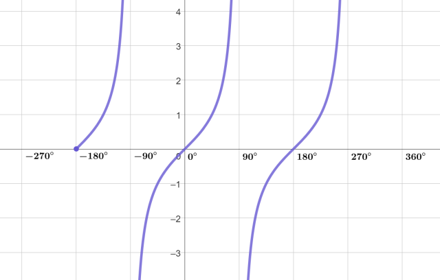 Dana jest funkcja y = tg α. Narysuj jej wykres w przedziale ⟨-180°; 270°⟩ i podaj jej miejsca zerowe.