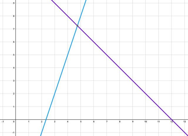 Proste przecinają się w jednym punkcie; układ równań ma jedno rozwiązanie.